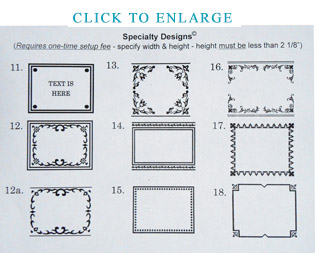 Size Limits for Large Labels - Labels should have one dimension -- either height or width -- smaller than 2 1/8 inches (the width of the print head of the machine); the other dimension should be no longer than 7.5 inches. Larger labels that require more than one "pass" over the leather incur a 20% surcharge on top of the cost of label. Also note that single graphic elements -- such as a box around the outside of a label -- normally can't be foiled in two passes due to slight misalignments. Email me for further details.